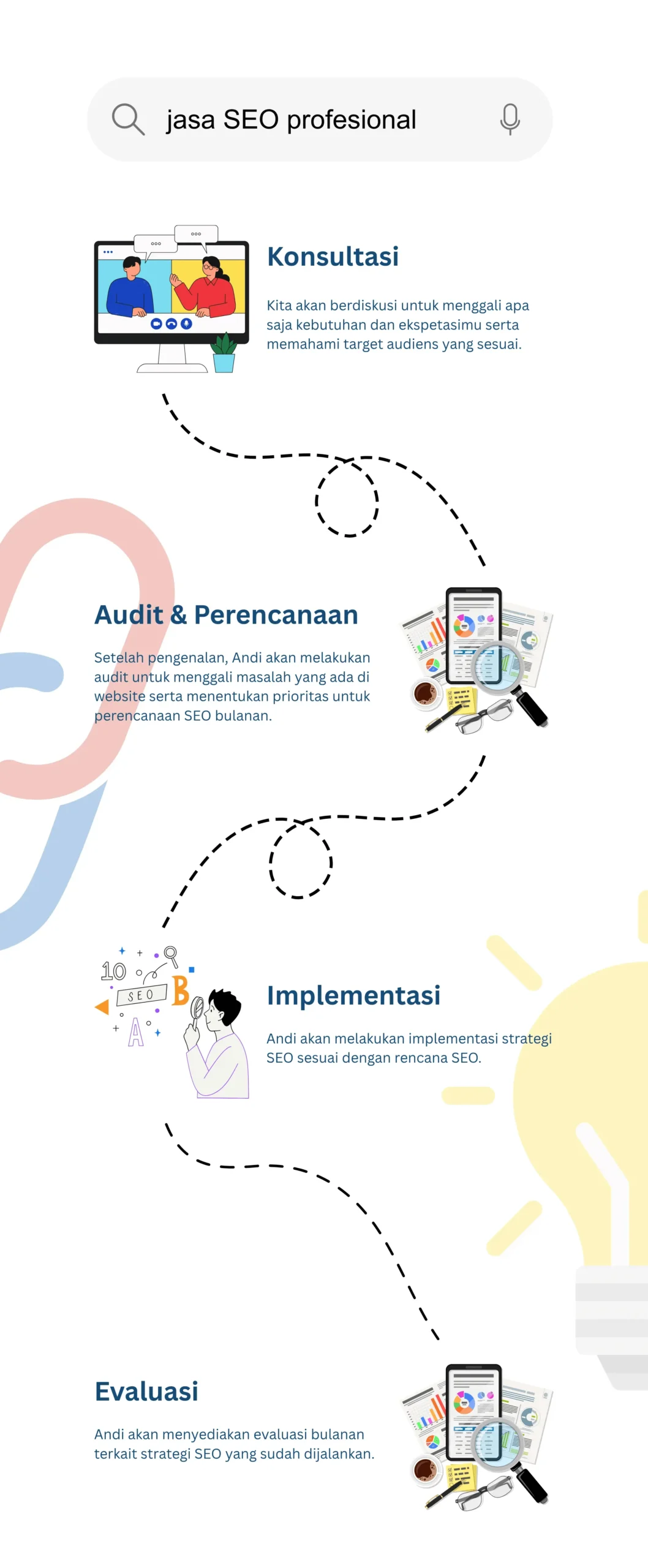 Layanan jasa SEO dari Andi siap optimasi websitemu dengan strategi terukur untuk raih target market secara organik, branding bisnis lebih kuat, dan peluang konversi lebih tinggi.
