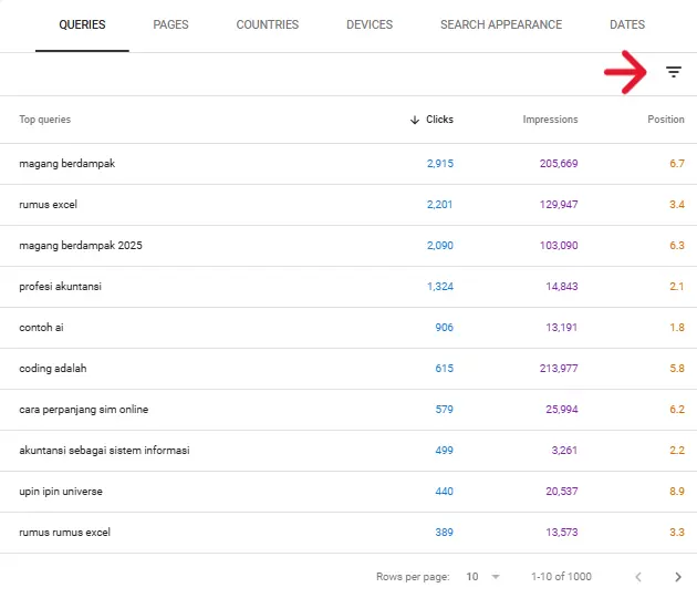 Dari semua kueri yang positionnya di antara 8-20, gak semuanya punya performa yang oke. Jadi, kamu bisa cek lagi clicks sama impressionnya untuk bahan pertimbangan.