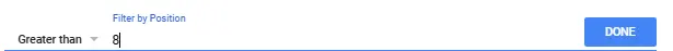 Pilih “greater than”, pilih 8-10. Supaya kamu dapat kueri yang rankingnya 8 ke bawah. Klik “done”.